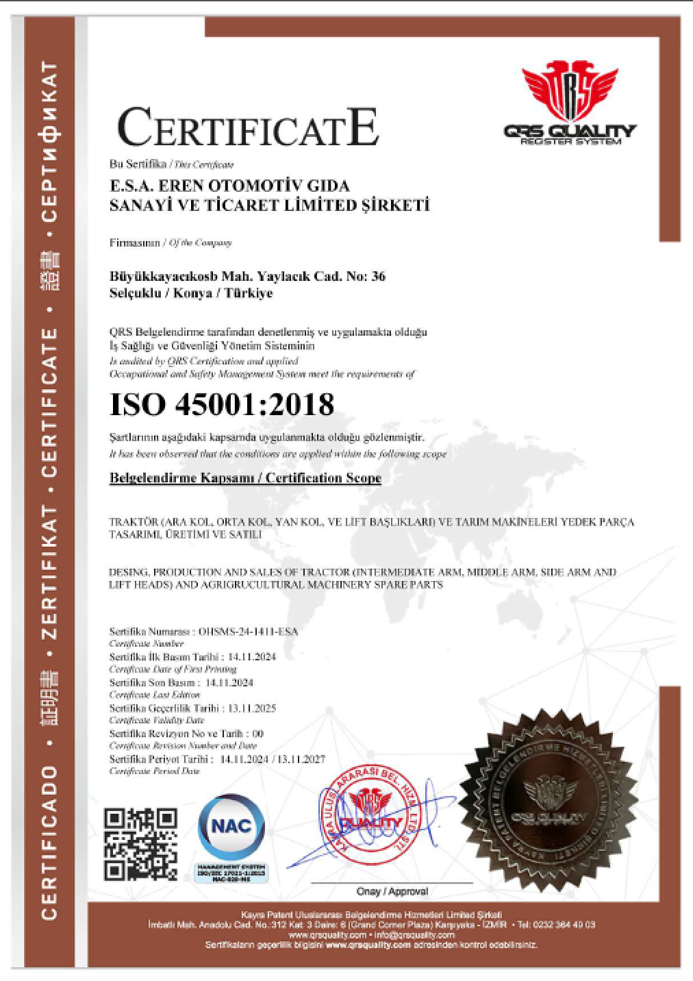 Esa Eren Otomotiv, which manufactures world-class spare parts for tractors in its modern factory in Konya Anatolia Industrial Zone, supplies its products to the market under the Esa Eren brand.